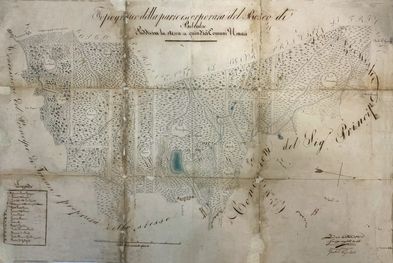 In questa topografia, realizzata il 30 ottobre del 1852 a firma dell’architetto Giuseppe Magliola e dei periti Giovanni Riccio e Gaetano Buja, è ricostruito uno scenario d’insieme. L’area del bosco fu ripartita in terreni di tre classi e gli appezzamenti di maggiori dimensioni furono assegnati a Scorrano, Supersano e Nociglia.