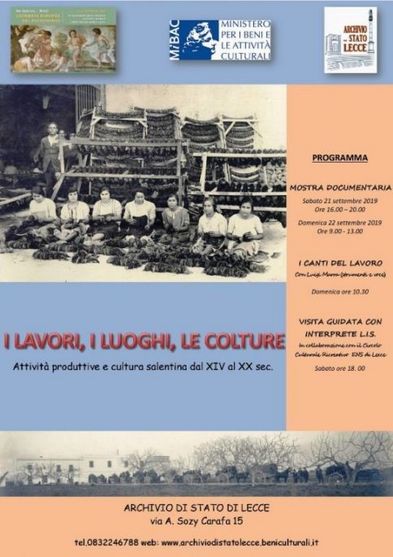 L'Archivio di Stato di Lecce partecipa alle Giornate Europee del Patrimonio (GEP) 2019, promosse dal Ministero per i Beni e le Attività culturali con due aperture straordinarie nei giorni di sabato 21 settembre ( ore 16,00 - 20,00) e di domenica 22 settembre ( ore 9,00 - 13,00). Il tema proposto "Un due tre... Arte! Cultura e intrattenimento" sarà sviluppato in ambito territoriale salentino tramite l'allestimento della mostra "I lavori, i luoghi, le colture: attività produttive e cultura salentina dal XIV al XX sec.". Questa esposizione offre una panoramica sul mondo del lavoro e delle attività produttive dell'antica provincia di Terra d'Otranto tramite alcune fonti documentarie dell'Archivio di Stato di Lecce, organizzate in un percorso cronologico, nella sede di via Sozy Carafa, 15. In questa occasione è sembrato doveroso dare un segno di ampliamento dell'accessibilità programmando una visita guidata con interprete L.I.S. per persone con disabilità uditive.