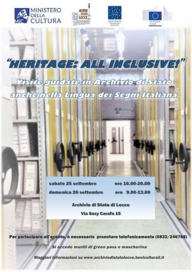 L’Archivio di Stato di Lecce aderisce alle Giornate Europee del Patrimonio 2021, la più estesa e partecipata manifestazione culturale d’Europa incentrata quest’anno sul tema “Heritage: all inclusive!”. Il 25 e 26 settembre p.v. si terranno presso l’Istituto percorsi culturali inclusivi, finalizzati ad ampliare la partecipazione dei cittadini nell’accesso al patrimonio documentario posseduto.